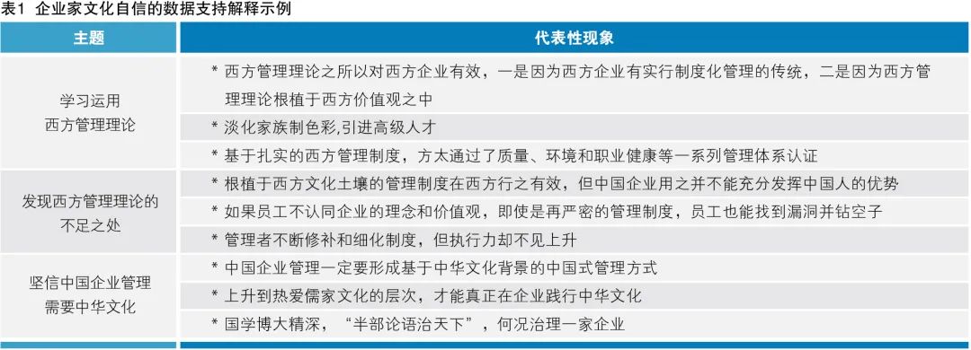 茅忠群的文化自信包括三個邏輯要素:學習并運用西方管理理論、發(fā)現(xiàn)西方管理理論的不足、學習中華文化并堅信中國企業(yè)管理更需要根植于中華文化之中,如表1所示。