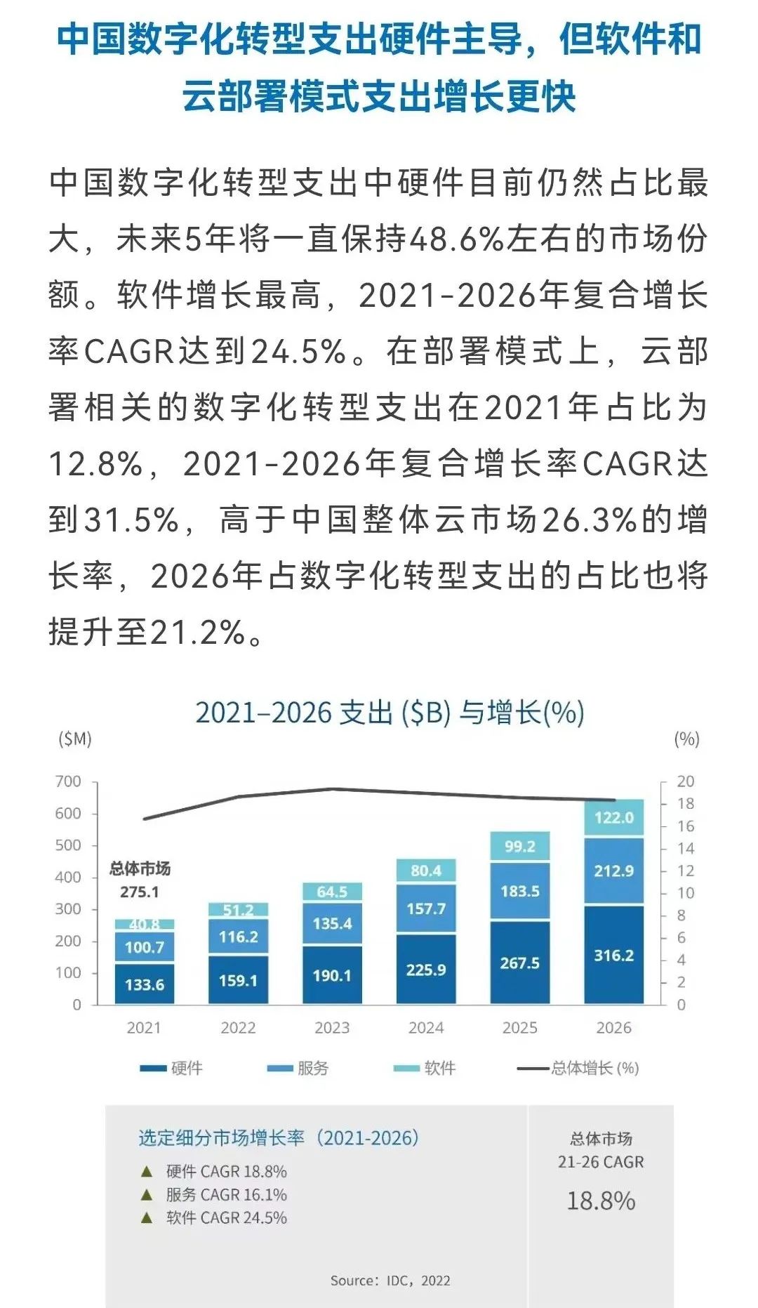 2022年,無(wú)論全球還是中國(guó),超過(guò)50%的經(jīng)濟(jì)(中國(guó)約超60萬(wàn)億元人民幣)是基于數(shù)字化或受數(shù)字化影響的,中國(guó)2022-2026年數(shù)字化轉(zhuǎn)型總支出將達(dá)到2.38萬(wàn)億美元。