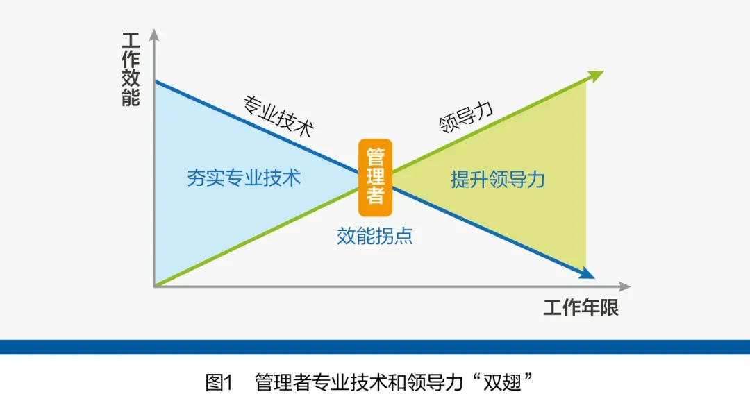 隨著工作年限增長(zhǎng)和職位提升,員工的專(zhuān)業(yè)技術(shù)對(duì)工作效能的貢獻(xiàn)率逐漸降低,其領(lǐng)導(dǎo)力對(duì)工作效能的貢獻(xiàn)率則不斷提升,兩條效能線的交匯點(diǎn)是員工可能成為管理者的重要節(jié)點(diǎn),如圖1所示。