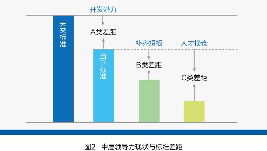 如圖2所示,根據(jù)“二八原則”,選擇20%左右績(jī)效好、潛力高的A類(lèi)中層管理者納入關(guān)鍵人才后備梯隊(duì),作為當(dāng)下標(biāo)準(zhǔn)對(duì)標(biāo)未來(lái)領(lǐng)導(dǎo)力標(biāo)準(zhǔn)(領(lǐng)導(dǎo)力模型),系統(tǒng)化提升領(lǐng)導(dǎo)力;對(duì)于70%績(jī)效良好但潛力一般的B類(lèi)中層管理者,對(duì)標(biāo)當(dāng)下領(lǐng)導(dǎo)力標(biāo)準(zhǔn),補(bǔ)齊短板即可;對(duì)于剩余10%績(jī)效差、潛力低的C類(lèi)中層管理者,通過(guò)員工晉升或外部招聘,進(jìn)行人才換倉(cāng)。