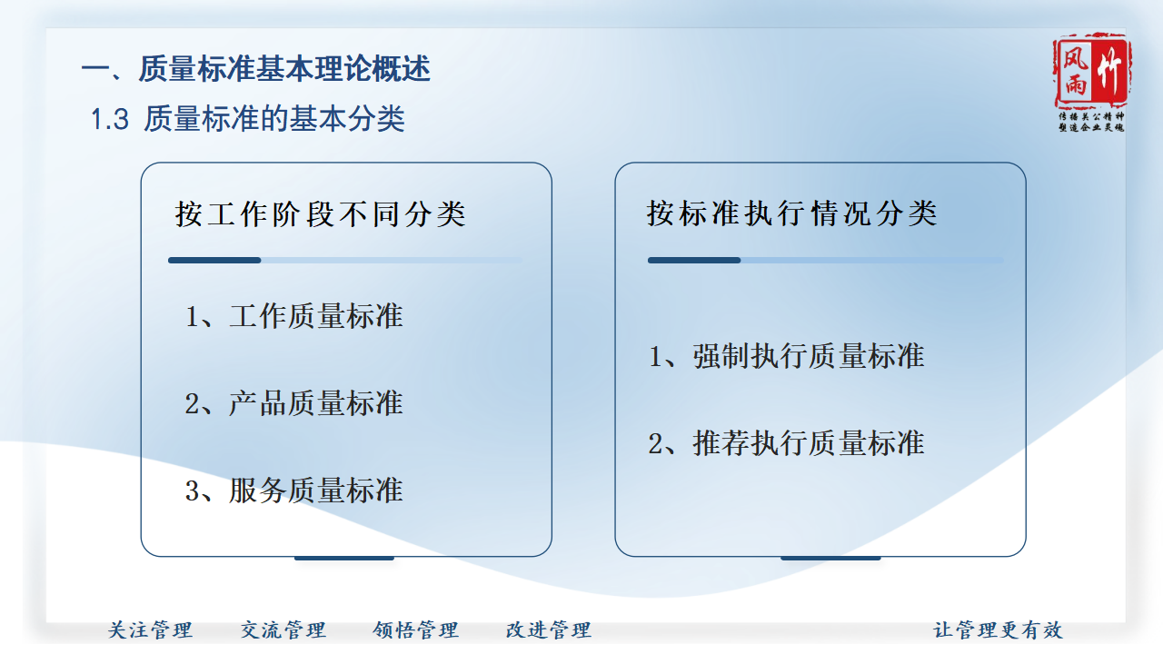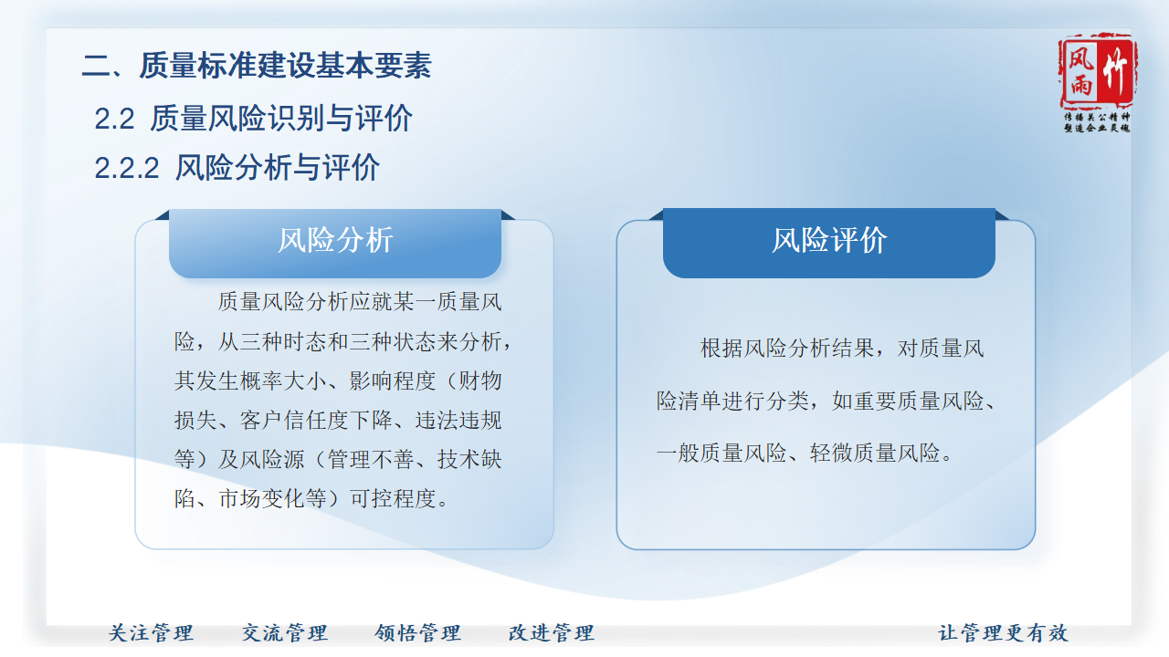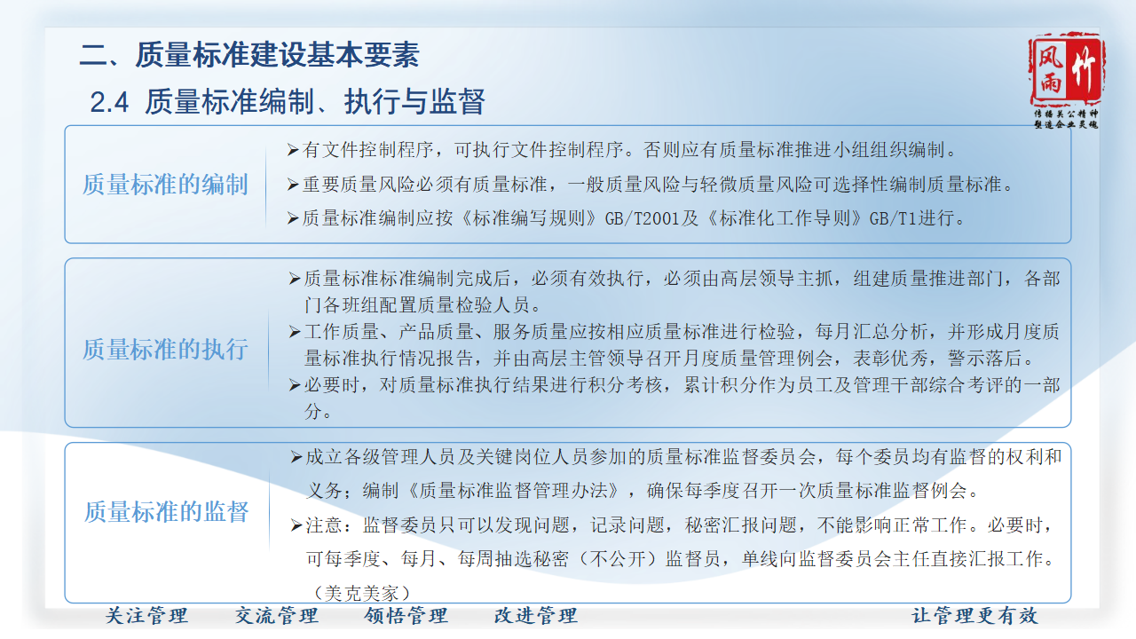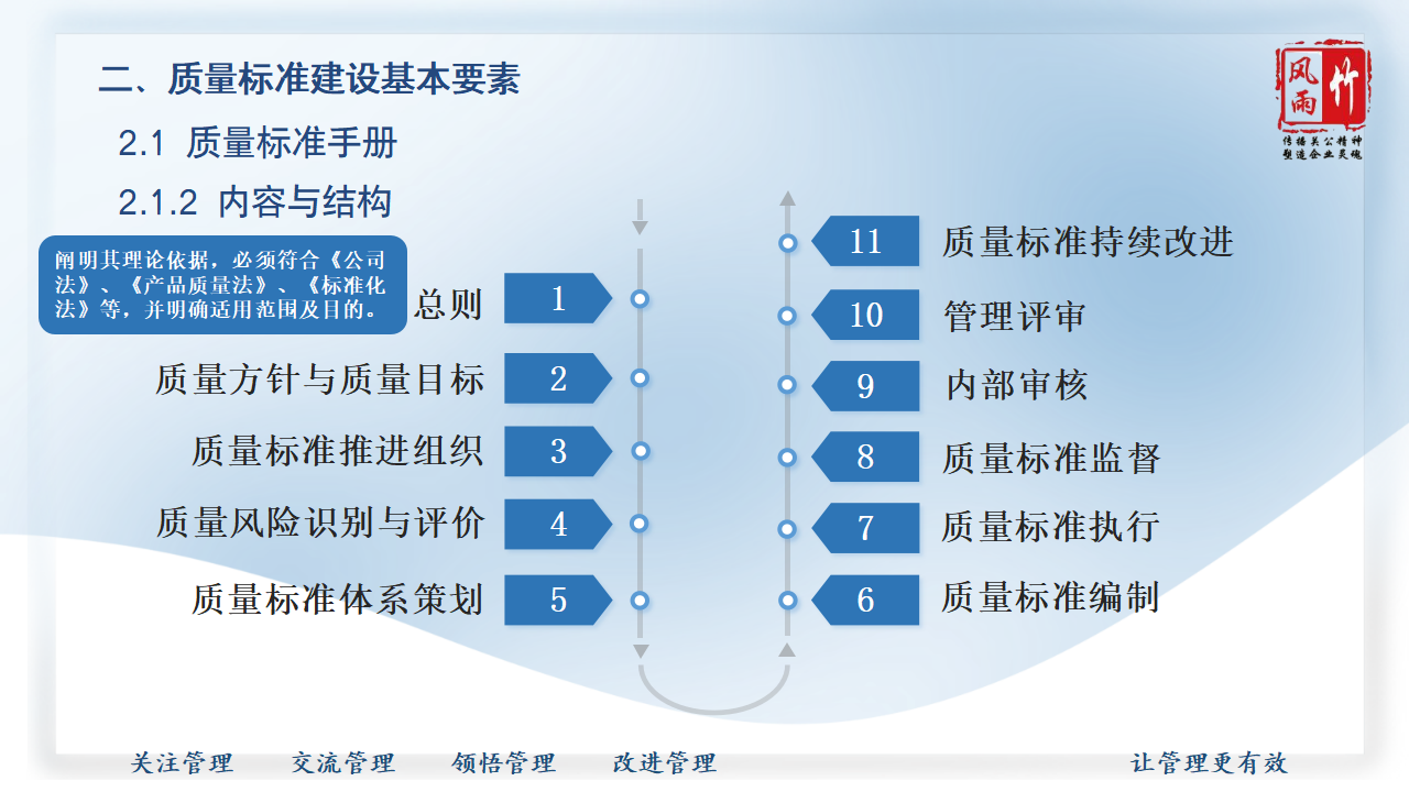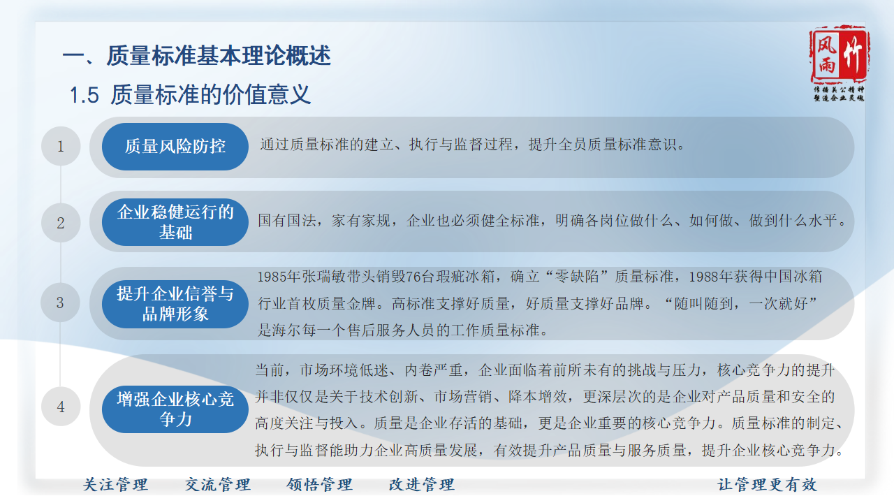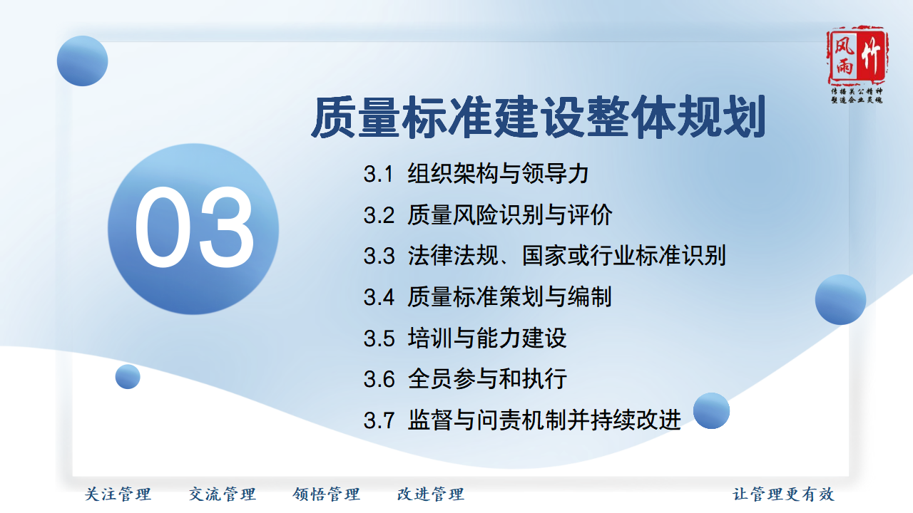 【精品課程分享】山西風雨竹公司王宏龍總經理傾力打造《質量標準建設》專題課程,已提報參選2025年山西省中小企業(yè)人才培訓"名師優(yōu)課"征集遴選活動!本課程融合王總20余年質量管理實戰(zhàn)經驗,系統講解質量標準體系建設方法論,通過真實案例解析幫助企業(yè)建立規(guī)范化質量管理體系,助力企業(yè)提升產品服務質量,增強市場競爭力。課程PPT現已開放共享,歡迎點擊觀看學習。