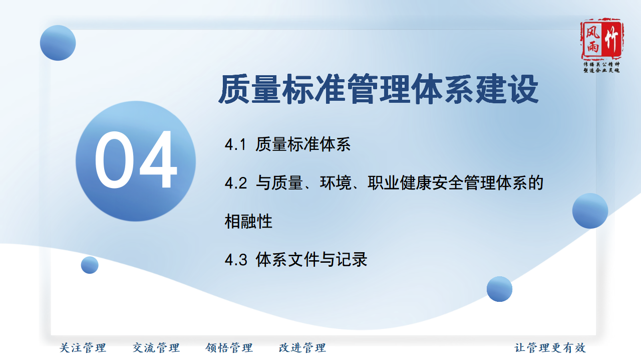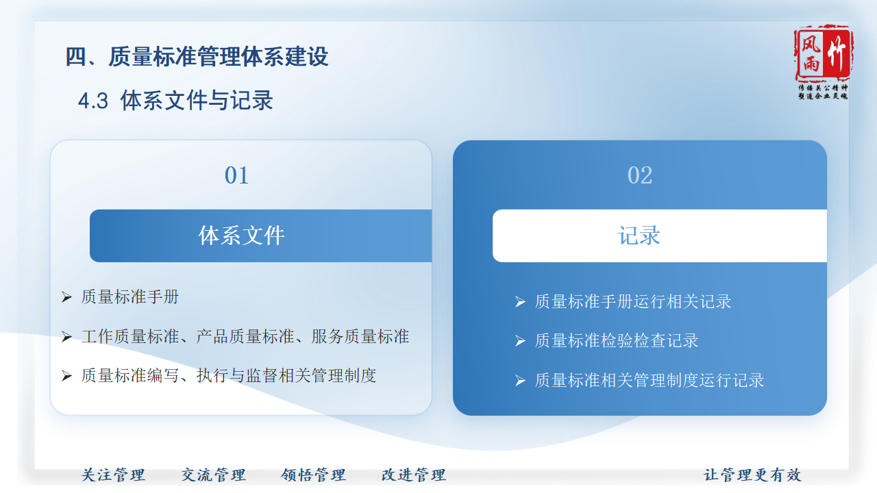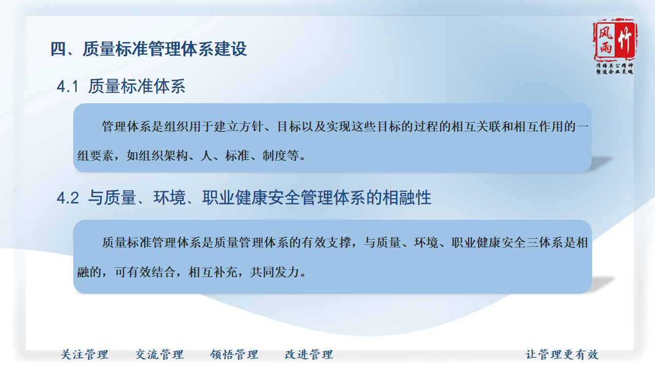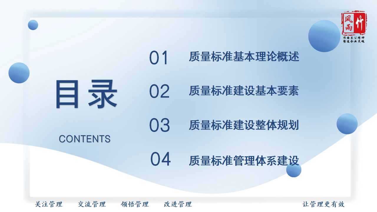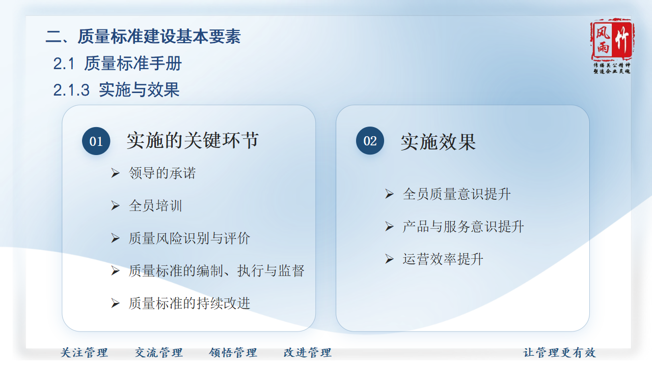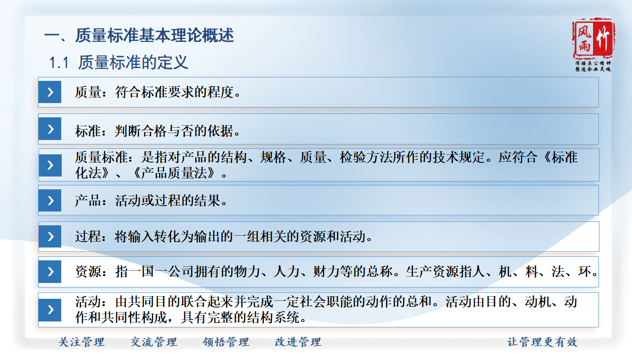 【精品課程分享】山西風雨竹公司王宏龍總經理傾力打造《質量標準建設》專題課程,已提報參選2025年山西省中小企業(yè)人才培訓"名師優(yōu)課"征集遴選活動!本課程融合王總20余年質量管理實戰(zhàn)經驗,系統講解質量標準體系建設方法論,通過真實案例解析幫助企業(yè)建立規(guī)范化質量管理體系,助力企業(yè)提升產品服務質量,增強市場競爭力。課程PPT現已開放共享,歡迎點擊觀看學習。